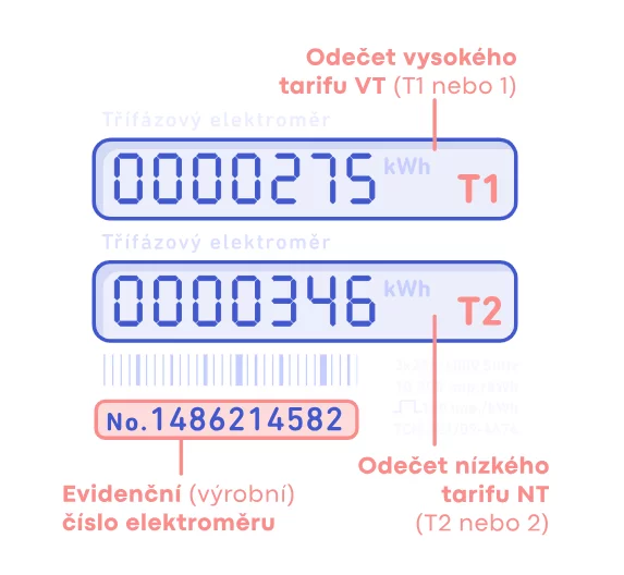 Kontrolní stav elektroměru zapisujte vždy pouze jako celé číslo, údaj za desetinnou čárkou není pro potřeby nahlášení odečtu podstatný. U statických digitálních elektroměrů se stavy tarifů (VT a NT) na displeji pravidelně střídají v intervalu cca 10 vteřin.